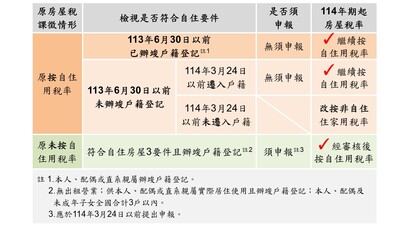 該處補充說明,民眾持有原按自住用優惠稅率課徵之房屋,如於今年6月30日以前本人、配偶或直系親屬已辦竣戶籍登記,無須提出申報即可繼續適用自住用優惠稅率;如於今年6月30日以前未辦竣戶籍登記,地方稅稽徵機關將於今年下半年主動寄發輔導通知書,提醒應於明(114)年期房屋稅開徵前40日(即明年3月22日,因適逢假日順延至同年月24日)以前遷入戶籍,才能繼續適用自住用優惠稅率;倘未於期限內遷入戶籍,自明年期起將改按非自住住家用稅率課徵,請屋主務必把握於該期限前辦竣戶籍登記。