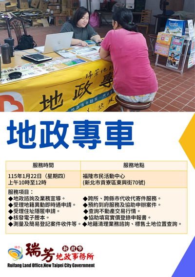 【新北市訊】新北市瑞芳地政事務所「地政專車」行動服務即將出發為市民服務囉!本次地政專車服務訂於115年1月22日(星期四)上午 10 點至12點,於福隆市民活動中心(貢寮區東興街70號)辦理,歡迎地方鄉親及市民朋友踴躍前來參加,近距離體驗便捷又貼心的地政服務。