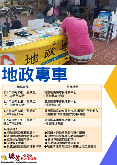 【新北市訊】為強化便民服務並提升民眾防詐意識,新北市瑞芳地政事務所「地政專車」暨防詐宣導行動服務,將於10月深入鄰里服務。此次服務時間及地點包括:10月15日(三)上午10時至12時於貢寮區馬崗市民活動中心、10月21日(二)上午10時至12時於雙溪區泰平市民活動中心、10月23日(四)上午9時至11時於貢寮區澳底公有零售市場1樓衛生所對面入口處攤位24號位置及10月27日(一)晚上7時至8時於瑞芳區基山里民活動中心,歡迎市民朋友多加利用。