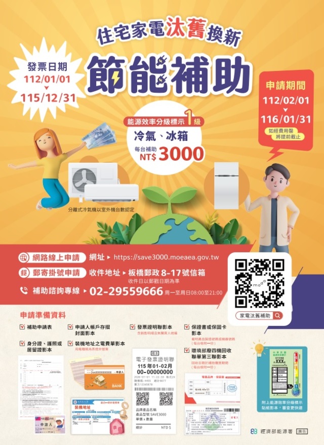 旨揭補助鼓勵全國住宅用戶汰換老舊家電,民眾購買一級能效冷氣機及電冰箱,符合汰舊換新條件者即可提出申請,每台新機補助新臺幣3,000元。相關活動資訊如下: