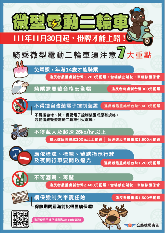 宣導-#微型電動二輪車 自111年11月30日起,掛牌才能上路及騎乘微型電動二輪車須注意事項。