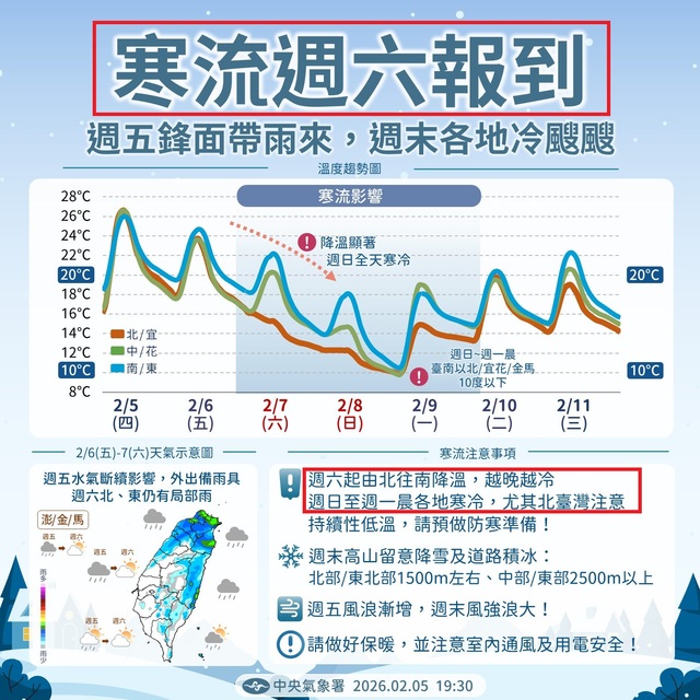 寒流週六報到,最明顯偏冷的時間,就會是在禮拜天到禮拜一的清晨,請大家多加件外套🧥,做好防寒準備