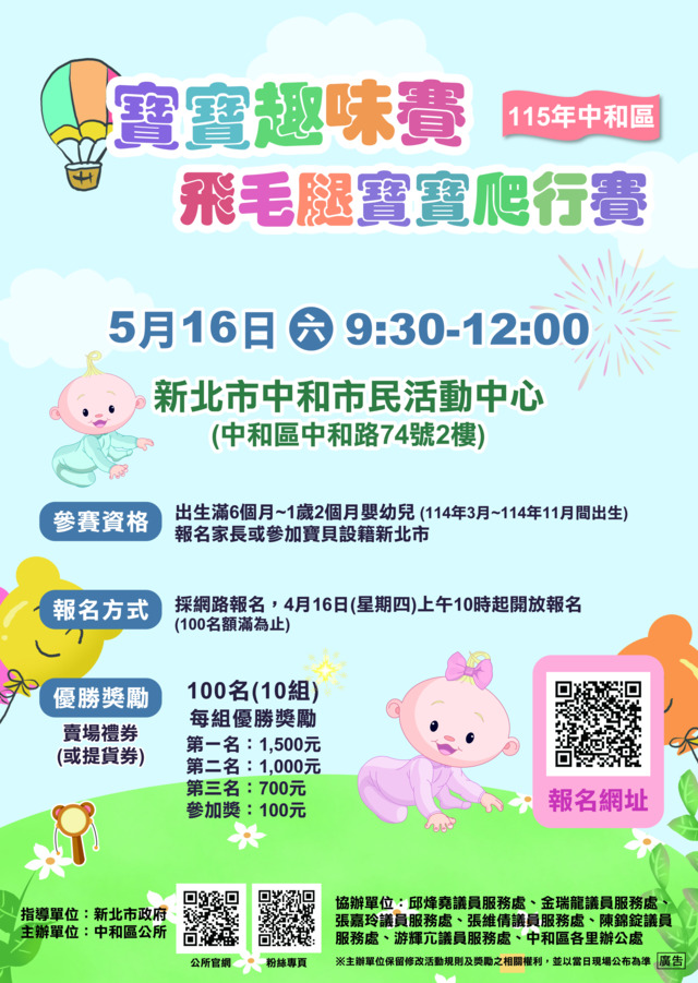 本所定於115年5月16日(星期六)於中和市民活動中心辦理「115年中和寶寶趣味賽-飛毛腿寶寶爬行賽」活動